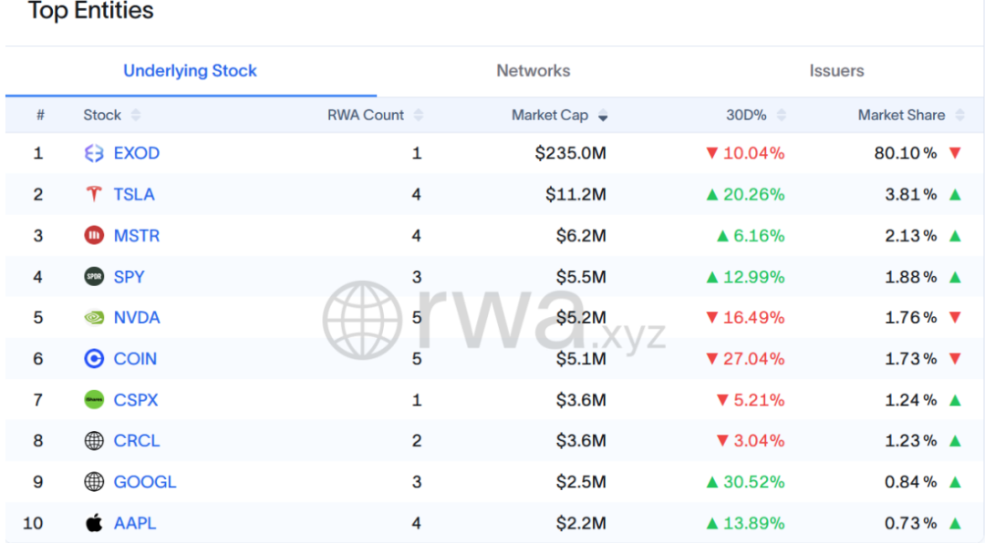 从底层资产的类型来看,当前市场上的代币化标的展现出清晰的策略性偏好,主要集中于两类:一类是“科技七巨头”等全球知名的高科技企业股票,另一类则是 Coinbase(NASDAQ: COIN)、MicroStrategy(NASDAQ: MSTR) 等与加密市场高度关联的上市公司股票。其中,特斯拉(NASDAQ: TSLA)的代币化产品是唯一市值超过千万美元级别的标的,其余产品的市场体量则多处于百万美元量级,整体市场深度依然较浅。