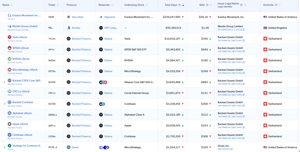 对现有市场规模进行解构,可以发现其构成较为特殊。市值排名第一的 EXOD(超 2.35 亿美元)属于2021年时合规框架下的原生股权上链,与主流的股票映射模式不同;而排名第二的 MGL 则是英国监管沙盒内的实验性产品,无法自由流转。剔除这两类特殊项目后,当前活跃的代币化美股市场格局呈现出高度集中的特点,其中由 Backed Finance 发行的 xStocks 系列产品占据了绝对主导地位,此外 Dinari、Swarm 发行的代币化产品也获得了一定的市场关注。
