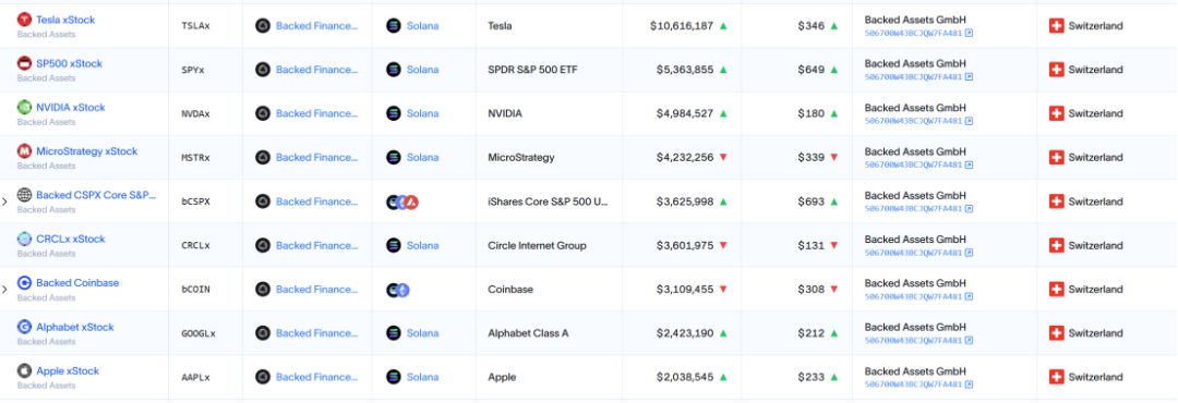 自今年 6 月 30 日起, xStocks 系列产品已陆续上线 Bybit、Kraken 及 Gate.io 等主流交易所(部分支持杠杆操作与做空机制)。其核心运作模式,是将 1:1 对应的真实股票交由 InCore Bank 等受监管的第三方机构托管,并在最初登陆 Solana 公链后,进一步将发行网络扩展至 BNB Chain 与 TRON,展现出清晰的多链发展策略。目前,Backed Finance 平台已提供超过 60 种美股代币,其热门产品在活跃的代币化美股市场中占据了绝对的主导地位。