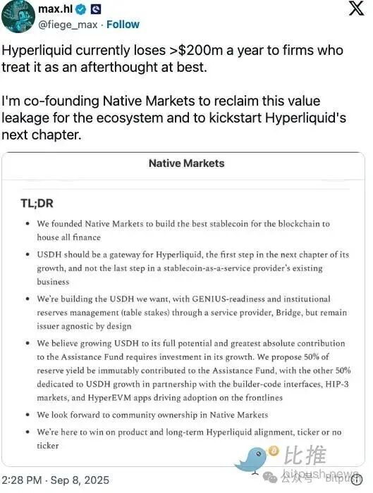 但最终,Native Markets 赢得了竞标——这是一个由备受尊敬的 HYPE 贡献者 Max Fiege、前 Uniswap Labs 首席运营官 MC Lader 和 Paradigm 研究员 Anish Agnihotri 领导的团队。