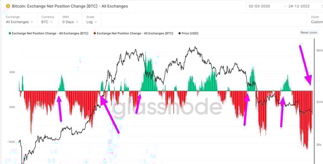 交易所净头寸变化正在寻求逆转翻盘,通常,在一个负面的指标之后,我们可能会看到一个短暂的恢复,这个指标显示在不久的将来可能会出现逆转。