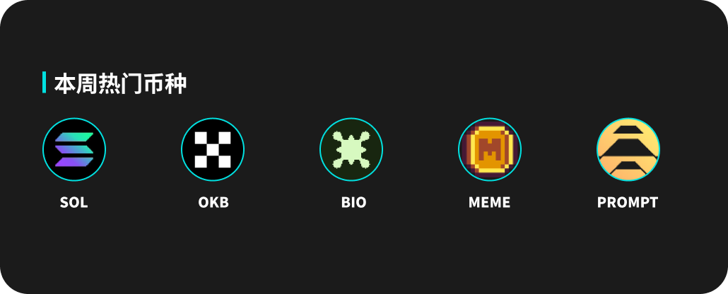热门币种方面,SOL、OKB、BIO、MEME 和 PROMPT 都有着不俗的表现。SOL本周价格上涨11.63%,最高价格213.01USDT。OKB价格上涨66.76%,24小时交易量2.55M。BIO和PROMPT本周分别上涨87.85%和173.67%。MEME本周价格上涨100.93%,24小时交易量130.45B。