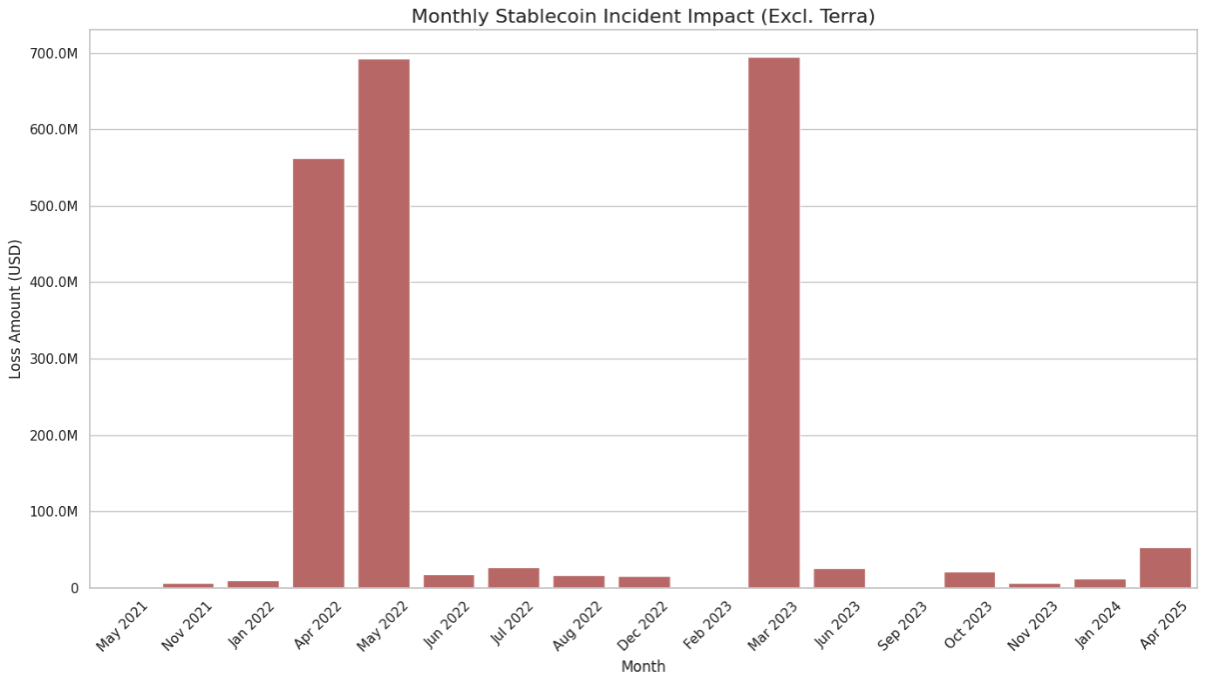 报告显示,2025年上半年,稳定币脱锚事件已造成超过5,000万美元的损失。这类事件是近年来风险演变趋势的一部分:自2022年以来,稳定币生态至少发生了26起重大安全事件,包括漏洞利用与价格脱锚,累计造成约205亿美元的财务损失。