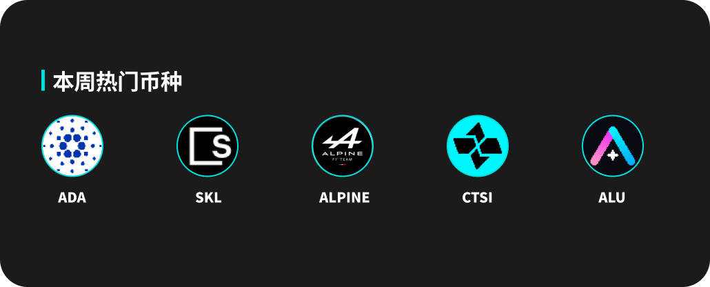 热门币种方面,ADA、SKL、ALPINE、CTSI 和 ALU 都有着不俗的表现。ADA本周价格上涨1.54%,最高价格1.0139USDT。SKL价格上涨58.79%,24小时交易量6.73B。ALPINE和CTSI本周分别上涨56.51%和43.75%。ALU24小时交易量1B。