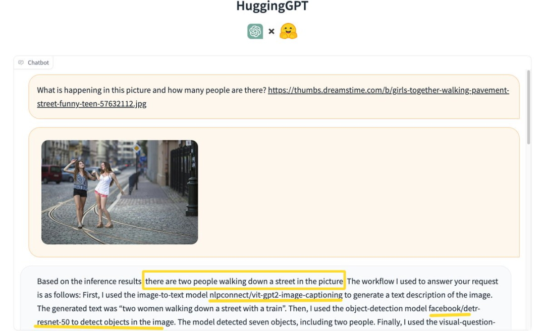 HuggingGPT根据推理结果,得出图片中有2个人正在街道上行走。