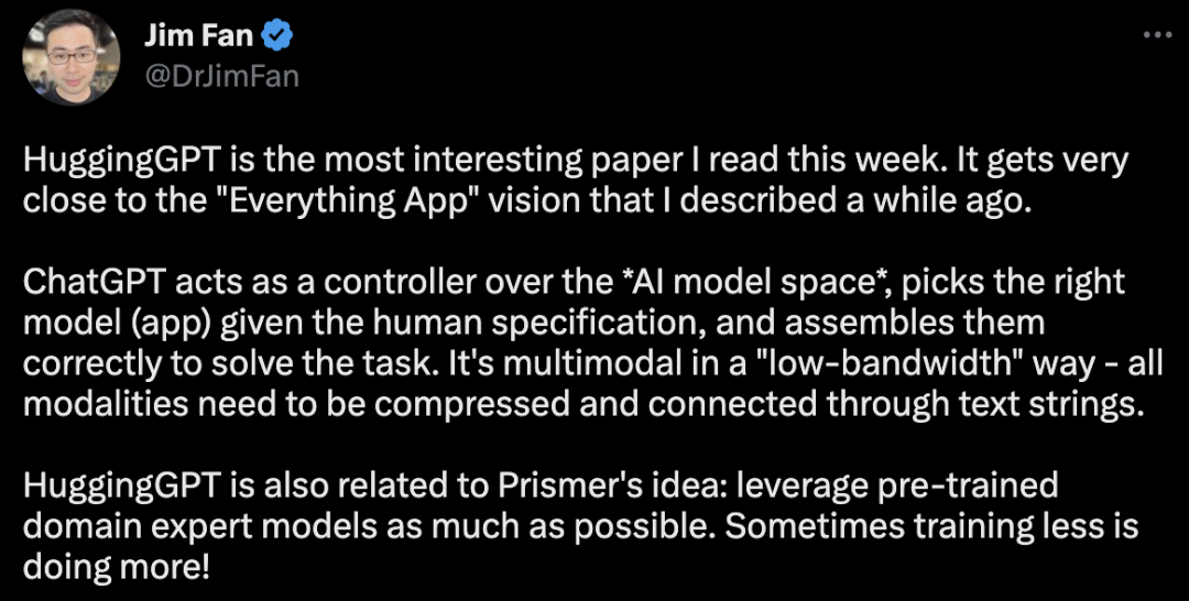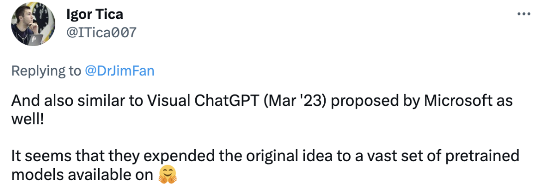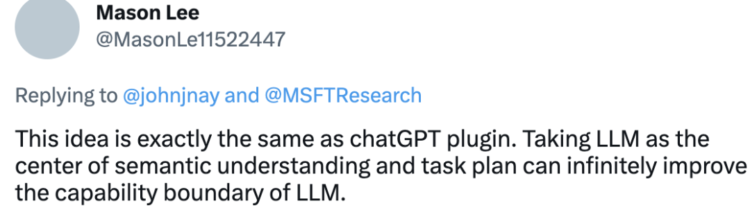 还有网友认为,这个想法确实与ChatGPT插件非常相似。以LLM为中心进行语义理解和任务规划,可以无限提升LLM的能力边界。通过将LLM与其他功能或领域专家相结合,我们可以创建更强大、更灵活的 AI 系统,能够更好地适应各种任务和需求。
