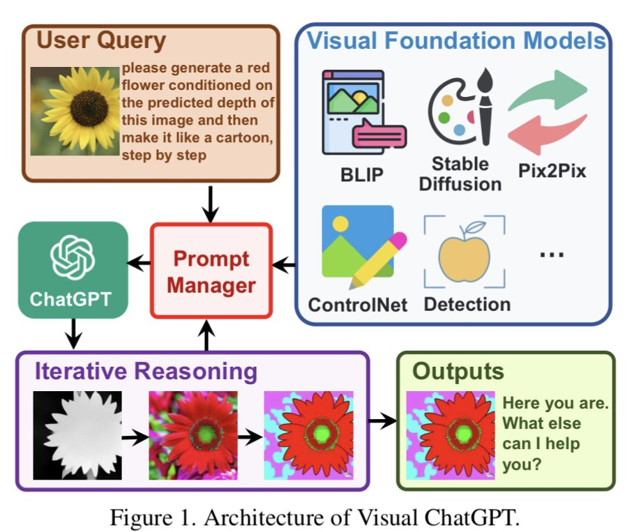 Visual ChatGPT是直接基于ChatGPT构建,并向其注入了许多可视化模型(VFMs)。文中提出了Prompt Manage。