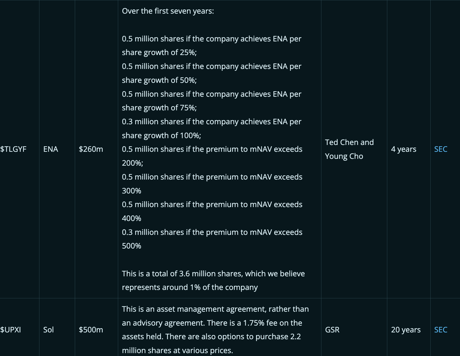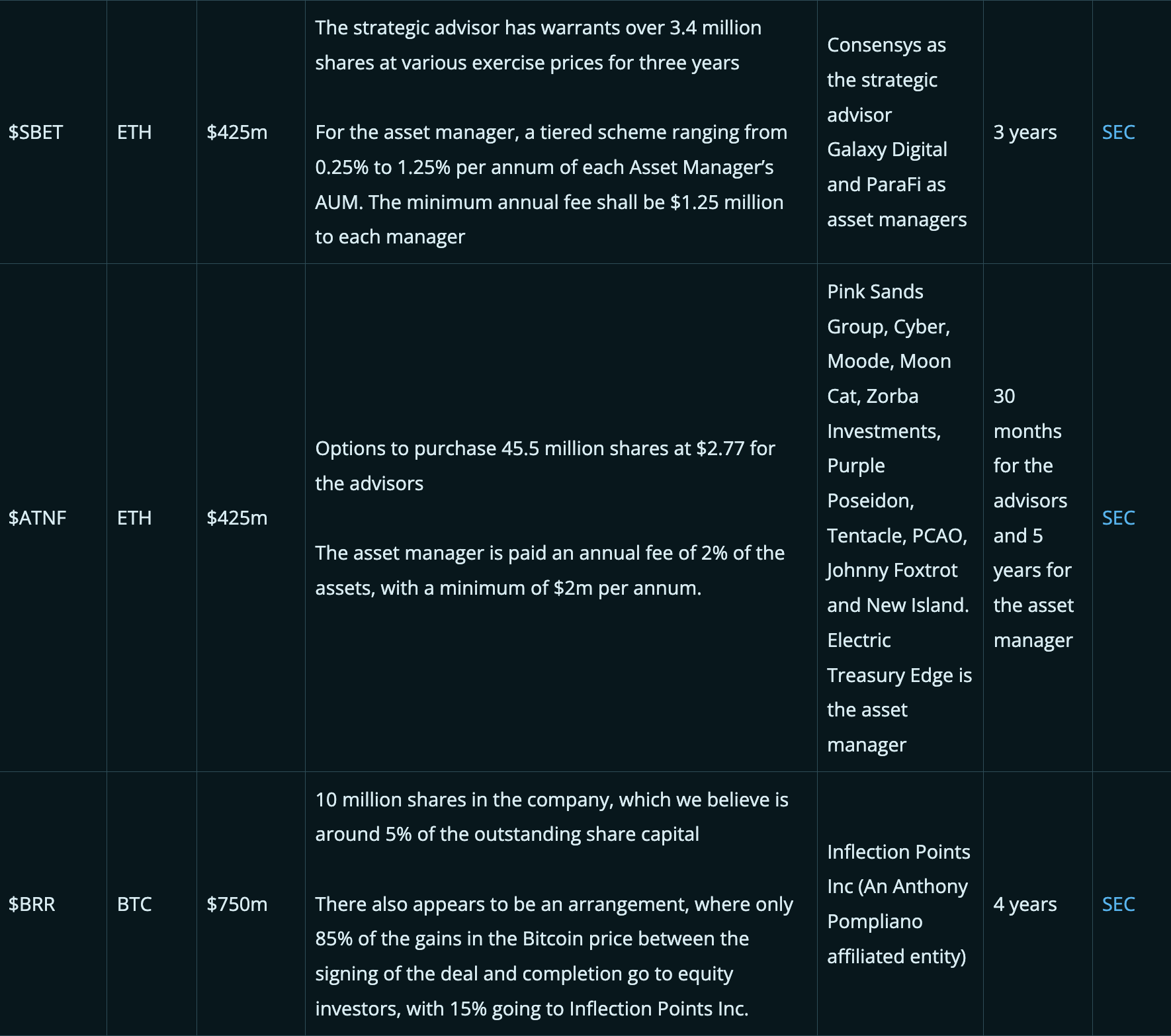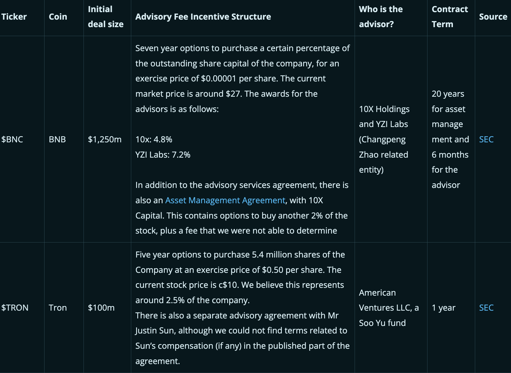 下表总结了一些交易中向“战略顾问”支付的一些关键激励和报酬,这些激励旨在鼓励管理层或顾问提高公司的市值或mNAV溢价。请注意,每笔交易都不同,我们在下表中进行的比较可能不完全恰当。有时,“资产管理人”的角色也会存在,通常是作为战略顾问的补充。此外,只有当我们能从SEC文件中找到相关细节时,公司才会被列入下表,因此表中的数据在某种程度上存在选择性偏差。对于某些案例,我们认为随着交易的完成,有关顾问协议的细节可能会在稍后浮出水面。