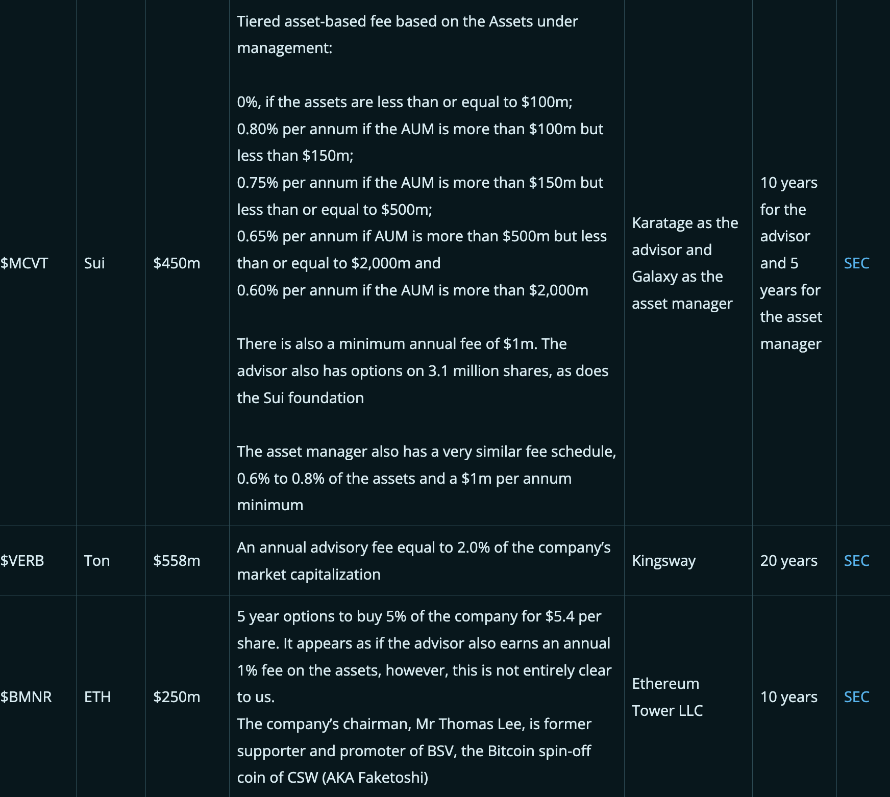 从某种程度上说,这些费用有时是合理的,因为参与这些交易的关键人物需要得到高额报酬,而且他们的报酬通常与mNAV溢价挂钩,所以激励与股东利益是一致的。然而,这些费用通常高到足以驳斥一些人提出的“财资公司比加密货币ETF更好,因为它们的费用更低”的论点。