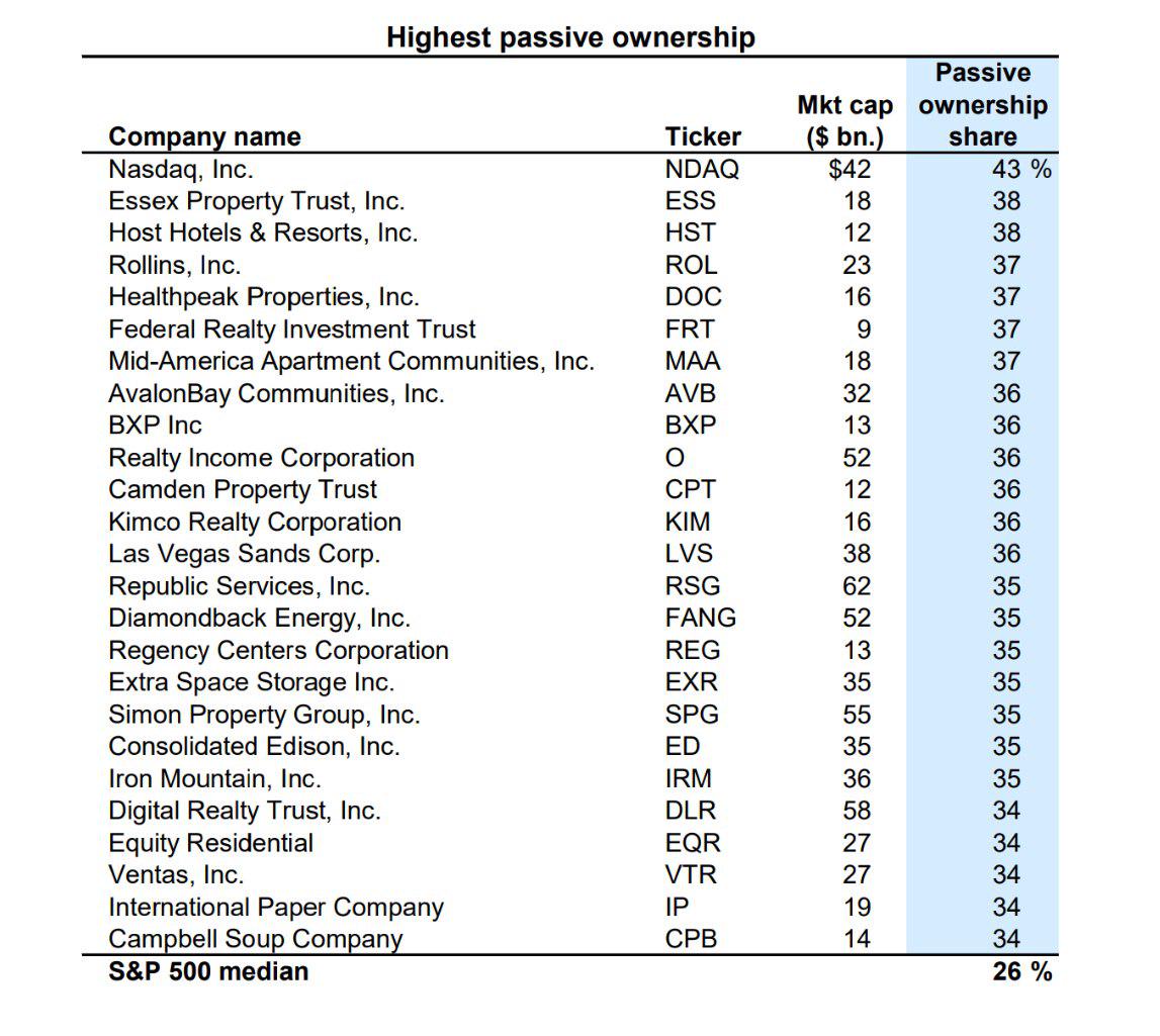 根据高盛2024年11月的一份报告,被动型基金对标准普尔500指数成分股的中位数持股比例为26%。另一个具有讽刺意味的是,作为加密财资公司家园的纳斯达克本身,在此特定名单中位居榜首,被动型基金的持股比例高达43%。