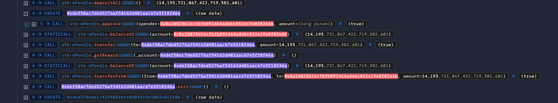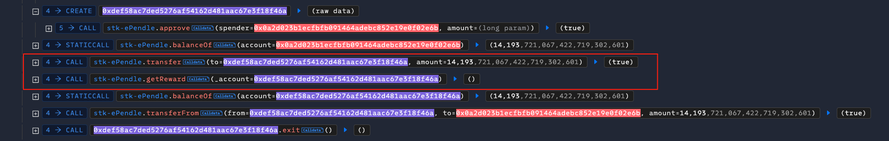 在攻击者真正的攻击流程中,⾸先通过 depositAll 来存入从 flashloan 借来的 ePendle 和之前使⽤ 0.1 ETH 兑换的 ePendle 获得了 stake-ePendle 。随后创建⼀个新的合约,将 stake-ePendle 转给新合约,利⽤ getReward 获取奖励。