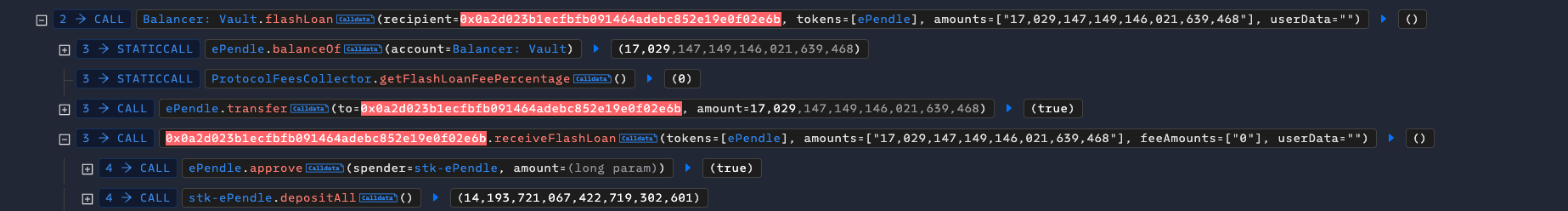 接着,攻击者⼜利⽤ flashloan 借了 17029 ePendle ,便开始真正的攻击流程。
