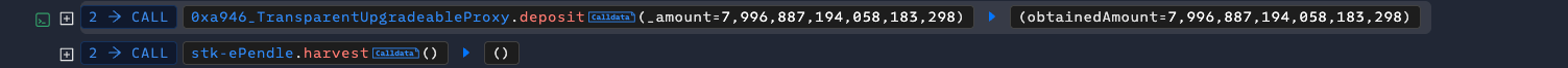 接着,攻击者通过 deposit 和 harvest 来将 PENDLE 存入 Equilibria 和获取收益再投资,⽬的是获取更多的 ePendle 。