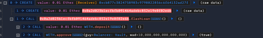 ⾸先,攻击者攻击者创建了⼀个攻击合约,转入0.1 ETH后通过Deposit获取了0.1 WETH。