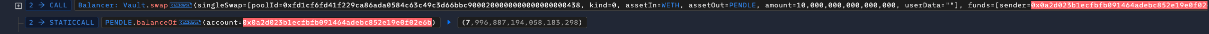 然后,攻击者使⽤了 0.1 WETH 兑换了 7.9 PENDLE ⽤于后续的攻击。