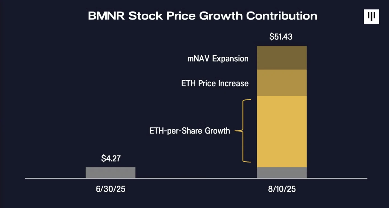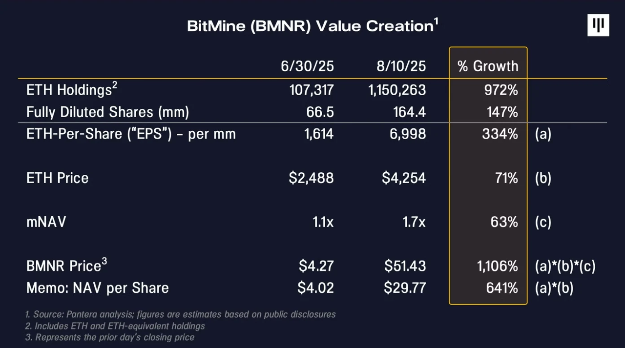 根据 Pantera 分析,以 BMNR 为例,其股价的惊人涨幅背后有着清晰的价值驱动逻辑。在 6 月底启动财库战略后的一个月内,BMNR 的每股 ETH 持有量激增 334%,贡献了约 60% 的股价涨幅;ETH 价格从 2,500 美元上涨至 4,300 美元,贡献约 20%;mNAV 从 1.1 倍扩张至 1.7 倍,同样贡献约 20%。