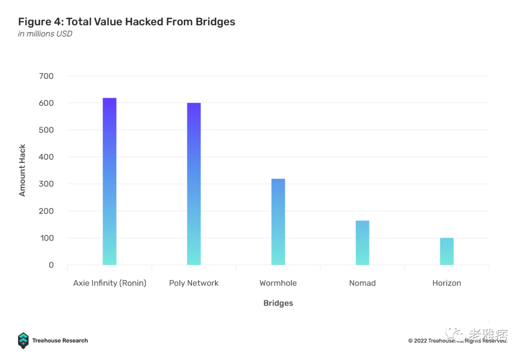 跨链资产桥是最广泛使用的互操作性补丁解决方案。这些桥梁允许用户将他们的资产从源链转移到目标链。桥梁由一个经过锁定、铸造、燃烧和赎回的系统提供动力。在两条链上,都将部署智能合约来锁定源链上的原生资产,并在目标链上以信用方式发行“打包”资产。例如,Bob 在以太坊上锁定了 10 个 ETH,并通过桥在 Solana 上铸造了 10 个包裹的 ETH (wETH) 。原则上,Bob 在 Solana 上铸造的 10 wETH 由锁定在以太坊链上的 10 ETH 以 1:1 的比例支持。Bob 可以做相反的事情,首先在 Solana 上烧掉 10 个 wETH,然后在以太坊链上赎回锁定的 10 个 ETH。在这种情况下,基本方面是管理供应并保证两条链同步。在 TVL 中,Bridges 已扩展到高达 US$12.35B。跨链转移资产的需求每天都在增长。问题是,这些资产桥梁的安全性和效率如何?不幸的是,由于持有大量资金,桥梁经常成为攻击目标并经常被利用,导致超过 1.8B 美元的资金受损。下面列出了一些值得注意的漏洞。- Poly Network:6亿美元Poly Network 黑客事件的发生是因为对两个重要协议智能合约的访问权限管理不善。结果,该系统被黑客入侵,该黑客能够添加自己的公钥来耗尽钱包。