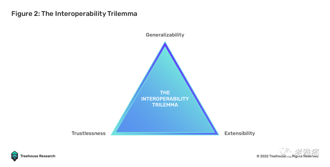 我们认为互操作性三难困境2很好地总结了真正可互操作解决方案的三个支柱:通用性、去信任性和可扩展性。正如读者将在后面的部分中发现的那样,当前的可互操作解决方案通常涉及牺牲一个或多个支柱来实现其他支柱。- 泛化性:指处理超越简单代币转移的复杂跨链交互的能力,例如智能合约调用和消息