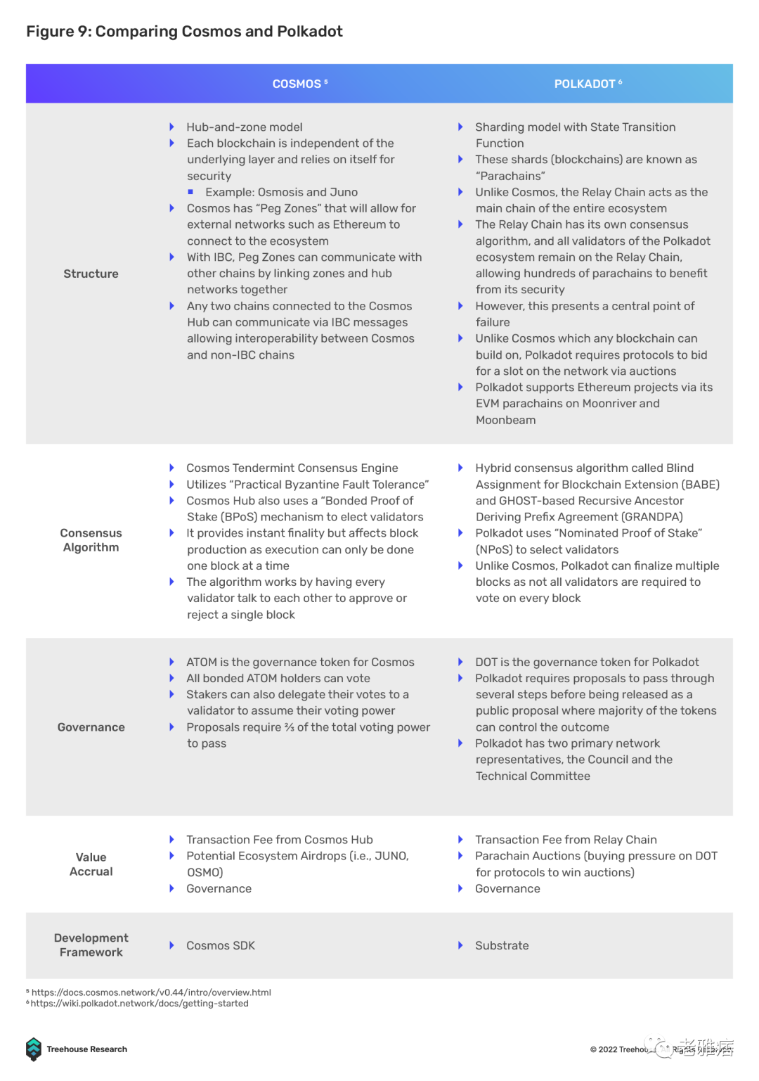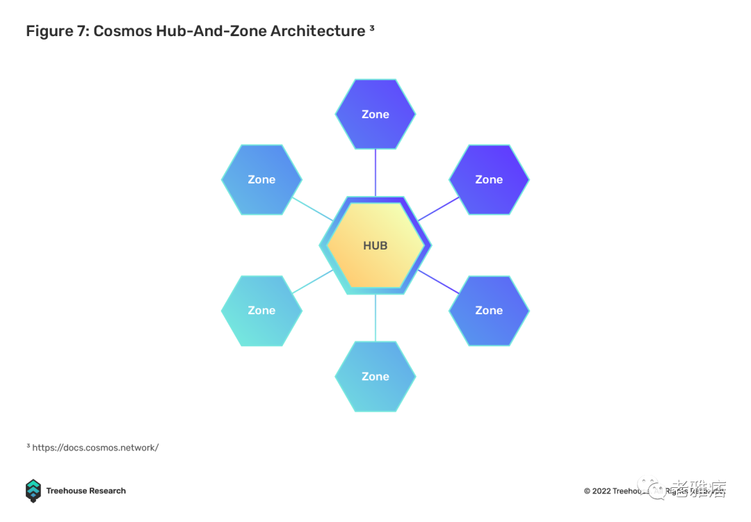 Cosmos 和 Polkadot 是同构“网络网络”的两个例子。它们被认为是区块链堆栈中的第 0 层。这两个第 0 层都为任何第 1 层区块链引入了一个标准,以连接到它们并形成一个可互操作的网络。Cosmos 通过跨链通信协议(IBC)实现互操作性。IBC 允许异构区块链以无需信任和无需许可的方式进行通信,方法是提供一个专用中继来验证块状态并以链间标准 (ICS) 进行通信。使用 IBC,独立的区块链将不必像使用桥接器那样进行双边通信。Polkadot 生态系统由专门的、专门构建的区块链组成,称为平行链。跨链互操作性是通过基于交叉共识消息(XCM)格式的协议实现的。XCM 格式类似于 IBC 的 ICS,标准化跨链通信。存在两种用于作用于 XCM 消息的主要消息传递协议,即垂直消息传递 (VMP) 和跨链消息传递 (XCMP)。VMP 允许平行链向中继链上传/下载消息,而 XCMP 促进中继链上的信息交换。虽然 Cosmos 和 Polkadot 的运作原理相似,但它们在连接性和安全机制方面的差异最大。Cosmos 允许任何人在其上构建,而 Polkadot 对其可用的平行链插槽有上限。Cosmos 上的区域依靠自身来确保安全,而 Polkadot 中的平行链可以依靠中继链的安全机制。话虽如此,Cosmos 和 Polkadot 都有自己的一系列挑战需要克服,因为两种设计理念都面临着一些相应的问题。第一个是引导问题。虽然 Cosmos 是作为一个开放网络构建的,任何人都可以在其中部署新链,但部署者将需要寻找一组全新的验证器,因为异构区块链之间不共享安全性。这个过程可能既耗时又低效,因为对于那些没有适当硬件和技术知识的人来说,操作验证者节点可能具有挑战性,从而使潜在候选人的数量非常有限。
