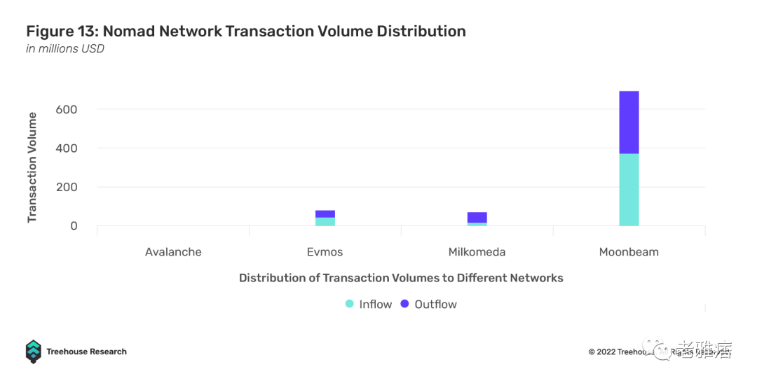 在一个刚刚起步的行业中,过去两年中,推出的大量互操作性协议使得跟踪和确定用户参与跨链活动的最佳路径变得越来越困难。因此,吸引最多用户的协议往往是与相应区块链的开发团队或基金会有正式合作伙伴关系的协议。就 Evmos 而言,Nomad Bridge 是推荐给新用户的官方网关,用于桥接来自其他链的资产。尽管有明确的DYOR警告,但官方合作伙伴关系通常被用户视为对推荐协议的安全性和可信赖性的认可。在 Evmos 和 cNomad 的案例中,Nomad 桥吸引了最多的交易量,交易流入超过 4.453 亿美元,因为用户信任 Evmos 的建议,但仅在 2022 年 8 月 1 日被利用,损失了超过 1.86 亿美元。这让我们回到了信息不对称的问题。虽然可能有更具成本效益和更快的桥接解决方案,但用户倾向于随波逐流,选择最“值得信赖”和“最安全”的协议。因此,信息不对称可能会阻止新的本地互操作协议来吸引更多用户,因为它们没有产生足够的意识。生态系统之间的互操作性