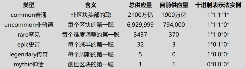 一个比特币是由一亿个聪(Satoshi)组成,前面提到Ordinals 协议会给每个聪进行编号,每个聪都会有自己的编号。关于聪的稀有度,Ordinals的官方文档解释,根据比特币自身的出块,难度调整,减半等一些定期时间,人为赋予聪稀有概念,从而使其具有收藏价值。