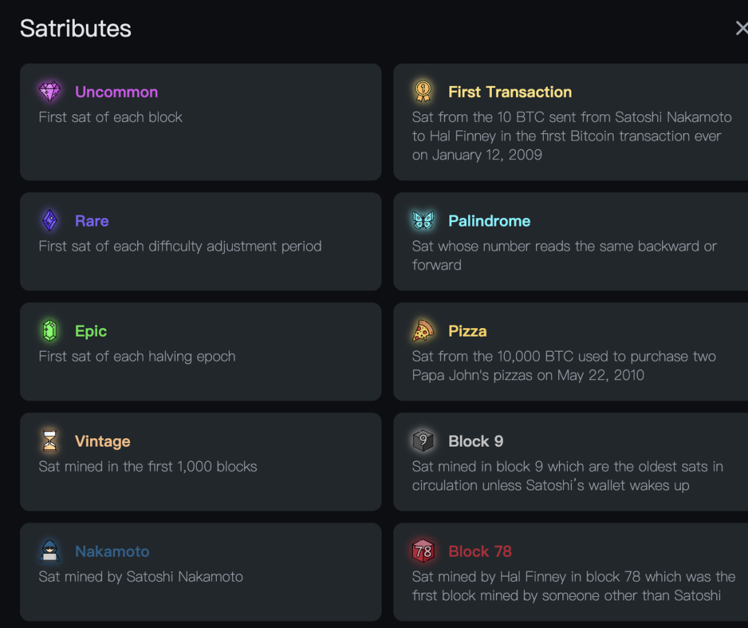 因为Ordinals的大热,作为铭文(inscription)载体的聪自然得到了有心人的关注,稀有聪相关概念应用而生。