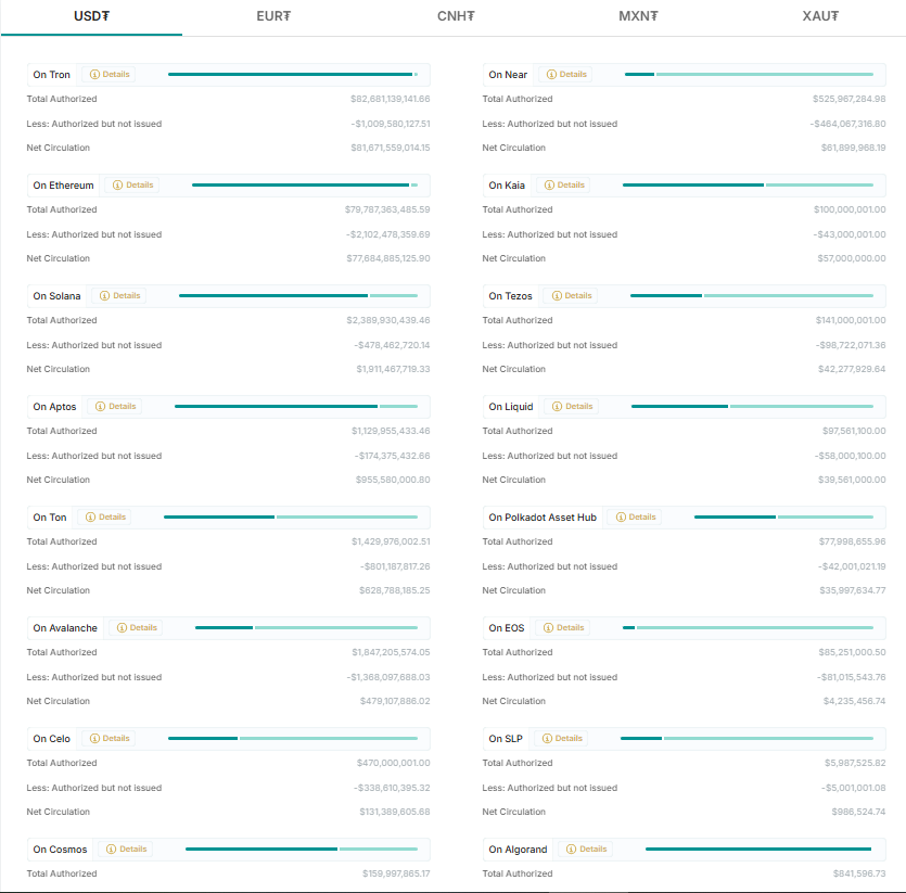 USDT 是目前最广泛使用的稳定币,其优势不仅在于市值和流通规模,更在于其全球化布局和广泛的实际使用场景。它广泛分布在 TRON、Ethereum、BNB Chain、Solana 等多个主流区块链上,尤其是在 TRON 链上的应用最为活跃,占总发行量的一半以上。TRON 相对较低的交易费用,使得 USDT 在亚洲、拉美、中东等地区成为 OTC、CEX 清算首选。同时,USDT 在新兴市场的跨境汇款、稳定价值存储、DeFi 流动性提供等方面有着不可替代的角色。例如,在委内瑞拉、土耳其、尼日利亚等高通胀国家,USDT 已成为民众实际使用的“替代美元”,甚至成为灰色金融体系中的结算工具。这种“链上美元”的角色让它逐步从交易工具演变为基础货币,承担起了部分“稳定资产”的功能性角色。