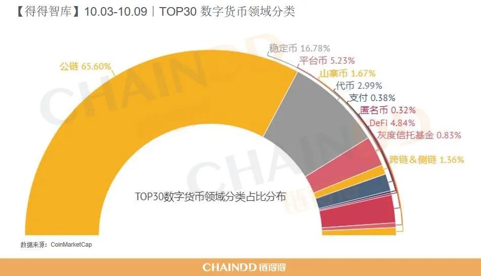 其中占比最多的领域是公链,占比为65.60%,排名第二的领域是稳定币,占比为16.78%。TOP 30数字货币领域分类的占比分布如下图所示: