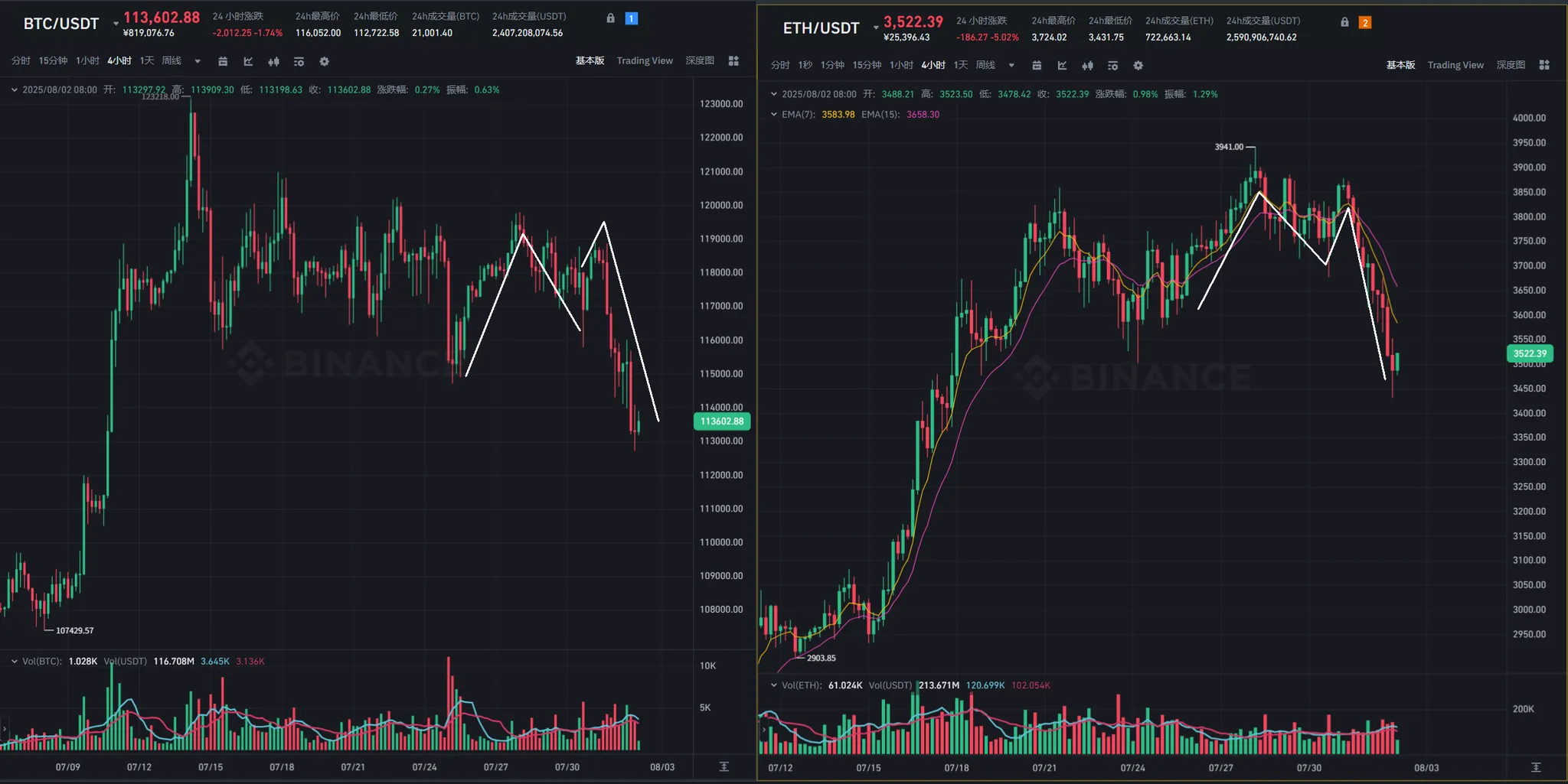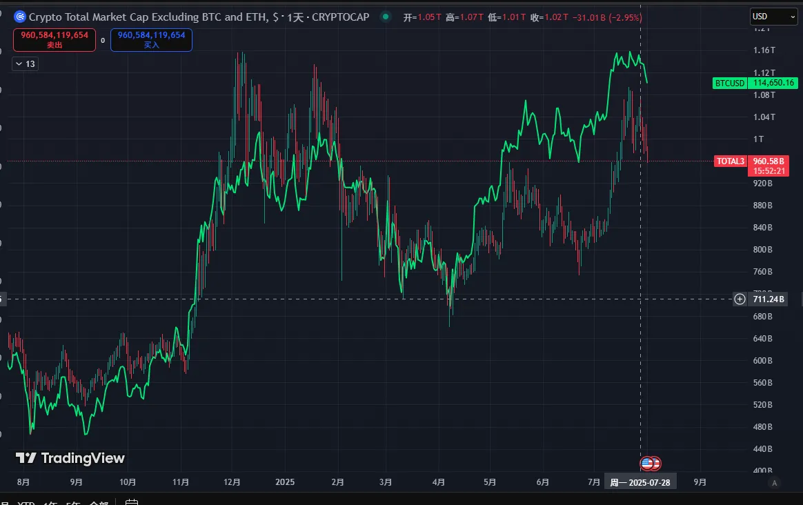 7 月 31 日凌晨,美联储议息会议释放鹰派信号(暗示年内或再加息一次),虽未直接引发暴跌,但技术面已显疲态 —— 原本有望冲击前高的 BTC 未能突破,反而在晚间出现破位,跌破 11.5 万美元支撑。8 月 1 日,叠加美股下跌(道指单日跌超 300 点)和特朗普关税政策正式落地(对部分进口商品加征关税),市场恐慌情绪蔓延,BTC 加速下探,最低触及 11 万美元下方,形成 “宏观 + 技术” 双杀格局。