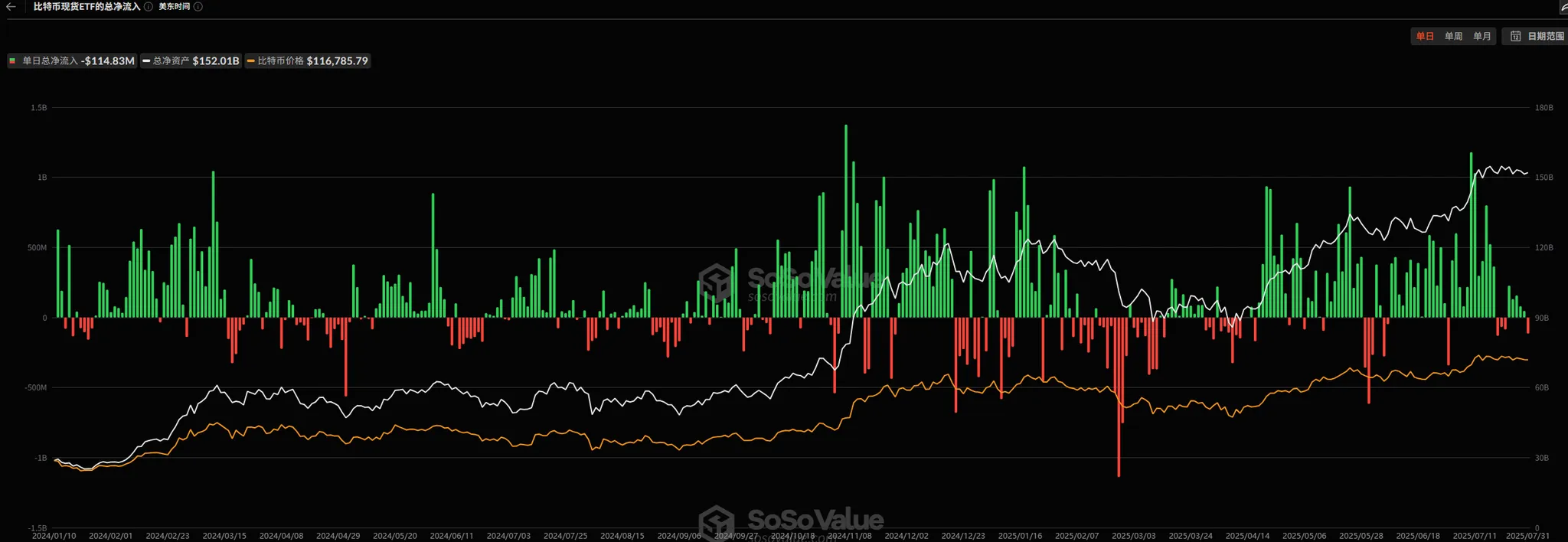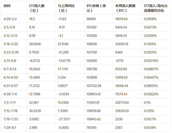 比特币 ETF 本周净流入 2.999 亿美元,虽与上周(3.0082 亿美元)基本持平,但较 7 月上半月(7 月 5-11 日净流入 22.96 亿美元,7 月 12-18 日 30.52 亿美元)已大幅缩水。更值得注意的是,本周五(8 月 1 日)ETF 出现单日净流出,这是近三周来首次,与 BTC 价格加速下跌形成 “负反馈”。