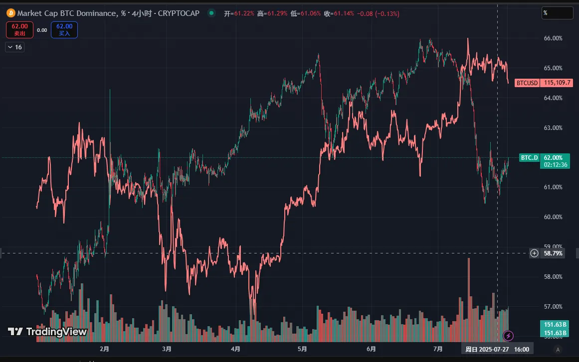 BTC市占率为62%,经过一周的震荡 ,大盘始终未能有效突破前高,带领行情进一步走高,山寨的情绪逐步降温,btc市占比开始逐步走高。