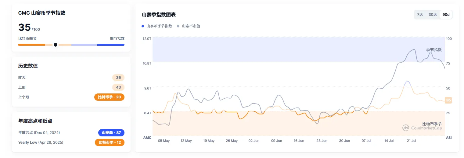 山寨指数从上周的 42 降至 35,连续 5 日处于回落通道,显示市场对小盘币种的信心持续流失。