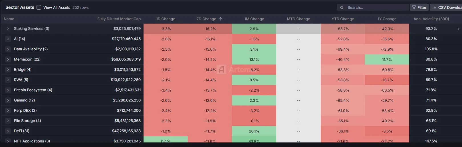 而主流山寨板块(如 DeFi、NFT、AI)普遍下跌,其中 meme 币板块跌幅超 8%,成为重灾区,反映出投机资金正在撤离高风险领域。
