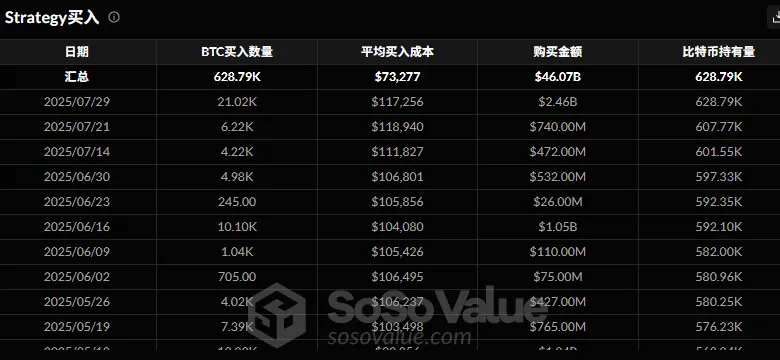 除此之外,本周微策略于7月29日以117256的平均成本买入了21.02K枚BTC,此次的买入金额为近四个月以来最大的一次,上一次如此大量的买入行为还是在年初3月31日比特币价格在87000附近时买入了22.05K枚比特币,目前微策略持有BTC的平均成本为73277美元持有总量来到了628.79K枚BTC,微策略购买现在已经成为比特币资本流入的重要组成部分。