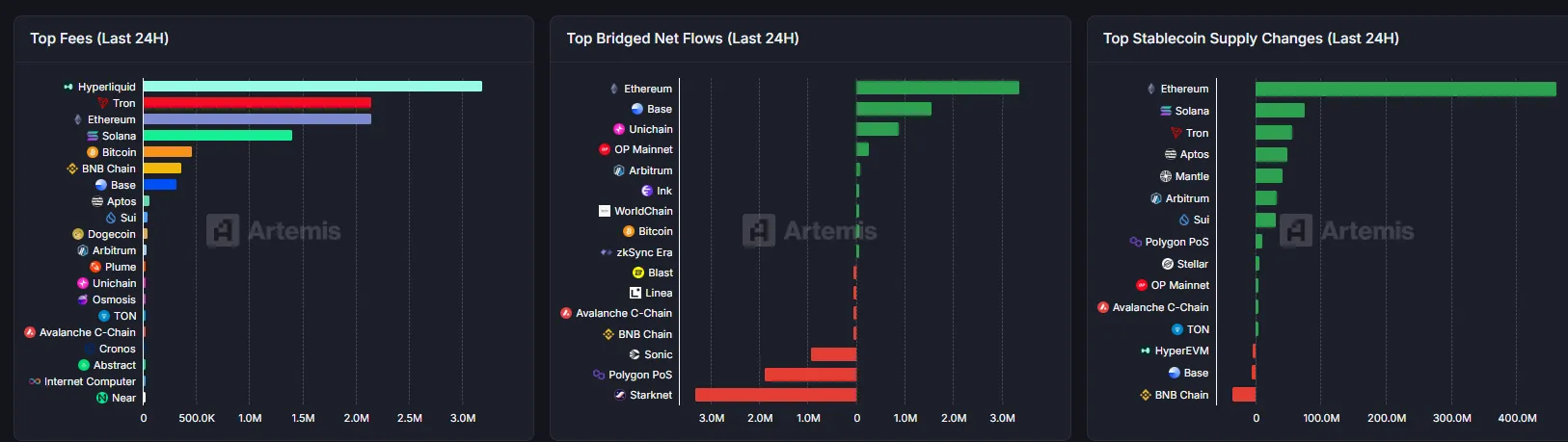 链上资产流向以及稳定币供应方面,ETH净流入最多、STARKET净流出最多,趋势仍然不变。