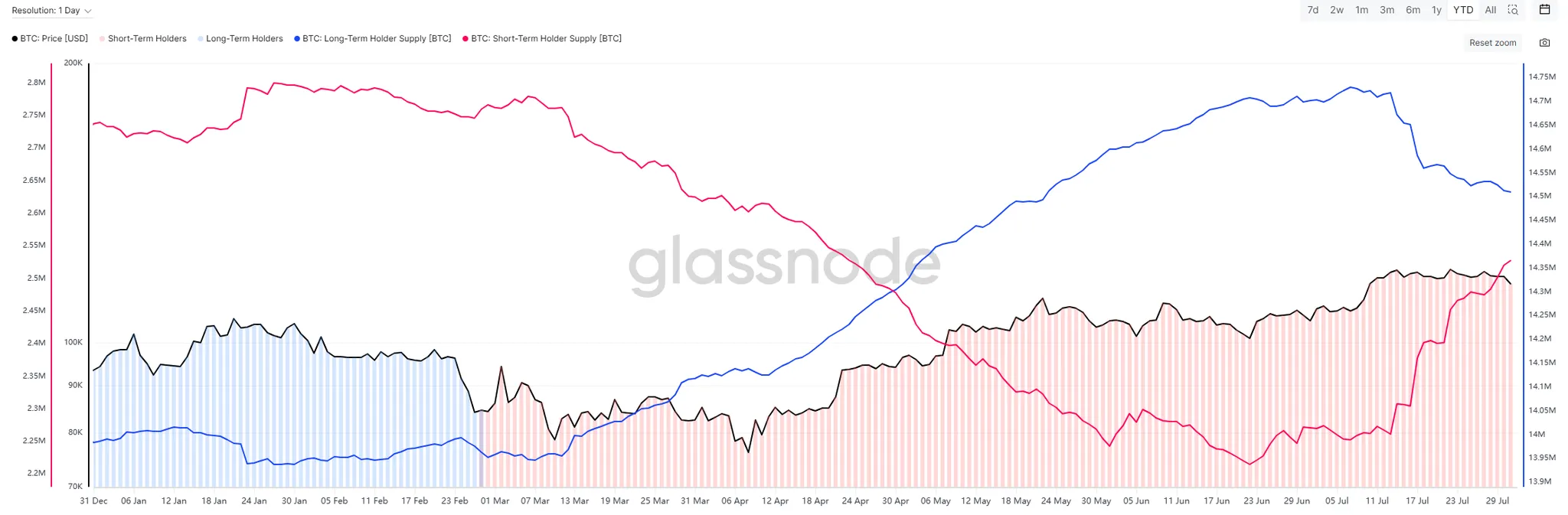 链上数据显示,本周比特币长期持有者(持币超 1 年)的持仓量持续下降,而短期持有者(持币不足 3 个月)持仓量加速上升,形成 “长抛短接” 的格局。