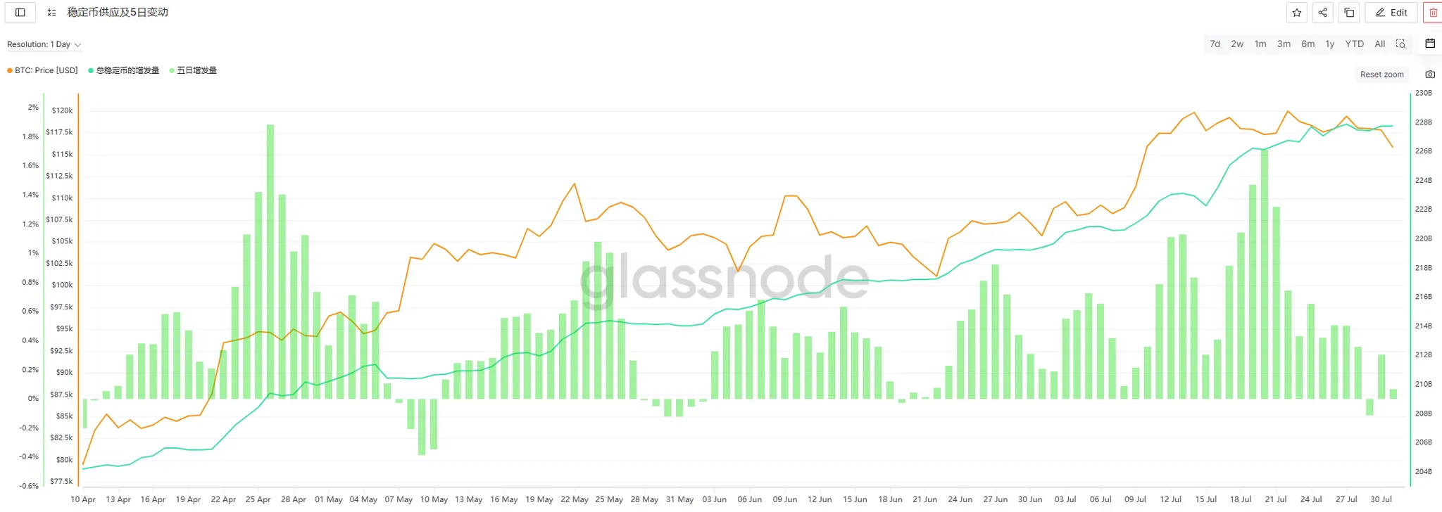 从历史规律看,稳定币增发是市场上涨的重要先行指标(如 7 月 12-18 日单周增发 34.51 亿美元,随后 BTC 从 11 万美元涨至 12 万美元)。而本周的 “零增长” 状态,反映出投资者对当前点位的谨慎 —— 既不敢在高位追涨,也不愿在下跌中盲目抄底。