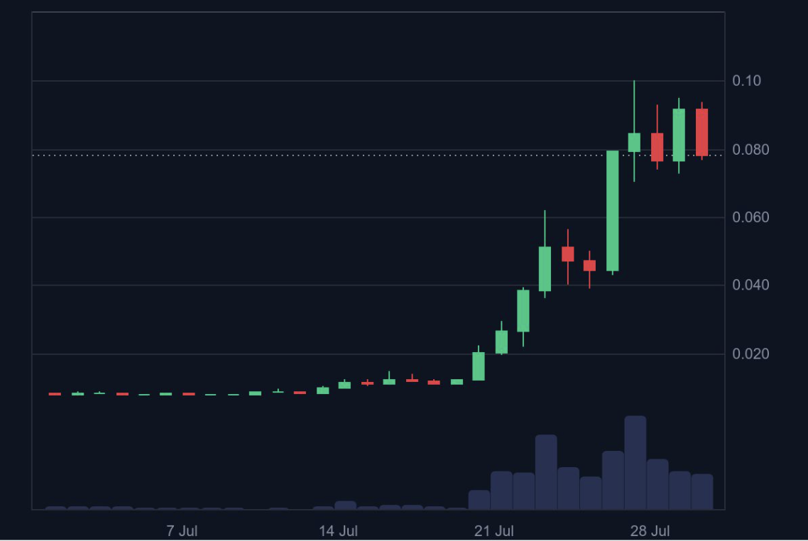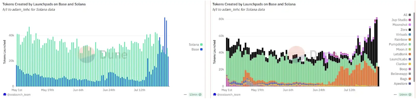 截至 7 月 30 日,ZORA 代币自月初的约 0.008 美元已上涨至 0.078 美元,曾于 7 月 27 日短暂触及历史高点 0.1003 美元,一个月总涨幅约达 875%,市值一度升至 7.81 亿美元,成为本轮行情最受关注的项目之一 。与此同时,自 7 月 26 日起,Base 网络日均代币发行数已连续三日超过 Solana,这在历史上尚属首次;在 Base 与 Solana 各自的发币市场份额中,自 7 月 23 日以来,Zora 平台持续领跑,截至 7 月 28 日当天,共发币 51,575 枚,占 Base 总发币量的 62.69%,超过同行项目 Letsbonk 与 pump.fun 当日发币总量之和。