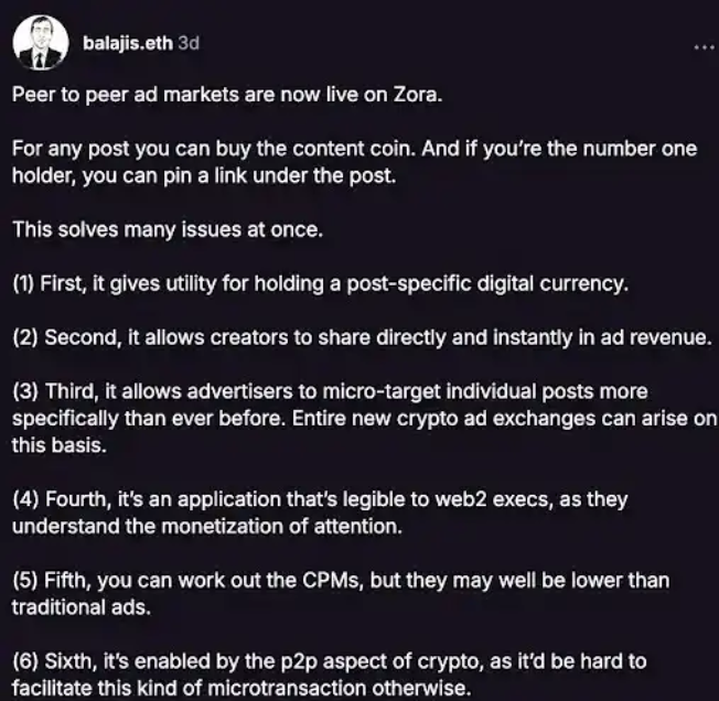 虽然目前品牌方尚未全面介入 Zora 内容经济,但可见的市场潜力正在形成。据 Zora 头部的创作者 Balaji 表示,这类广告机制正在逐渐演进:当前已有最大持币者可以通过置顶评论参与内容曝光,这本质是一种初级广告单元。如能全面系统化将此机制与品牌合作整合,将不仅为创作者带来收益,也能使广告收入以代币形式原生融入系统,而非走传统路径 。