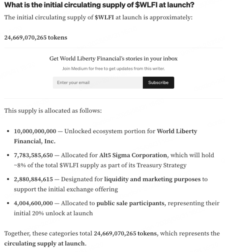 根据WLFI 博客显示TGE 初始流通为 24,669,070,265 枚代币,即24.6%,包括