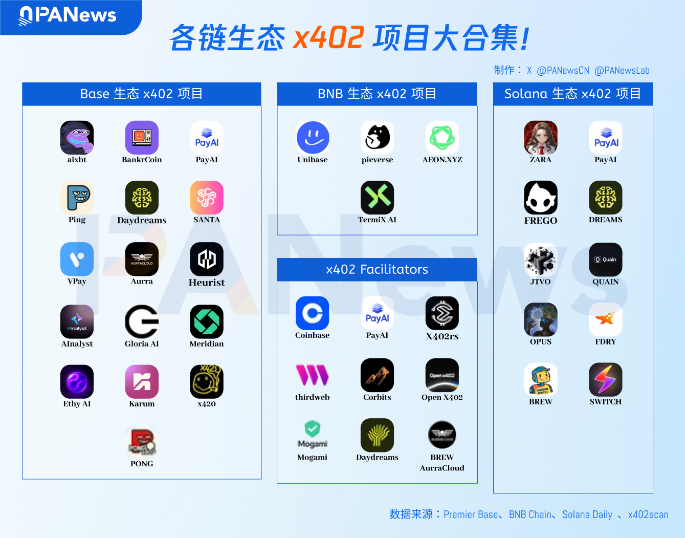 x402协议热度虽回落,但已在加密应用层开辟新蓝海赛道。Base、BNB、Solana等多链项目入局,生态版图从支付、AI到Meme快速扩张。