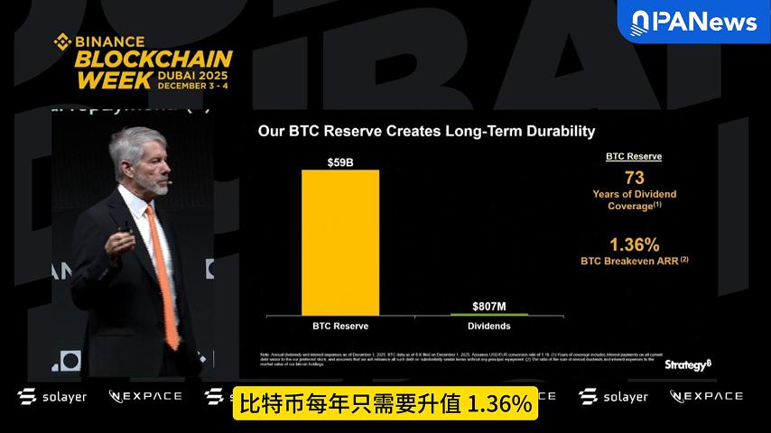 MicroStrategy在迪拜透露持有600亿美元BTC,负债仅80亿美元,杠杆极低。比特币年涨1.36%即可永续支付股息,新增14.4亿美元现金可覆盖21个月股息。